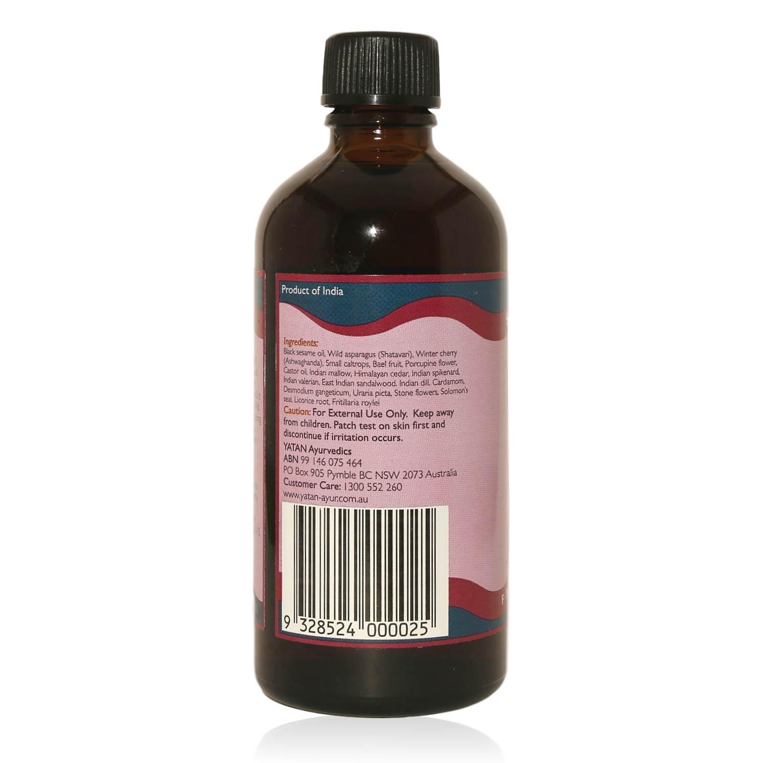 Ingredients: Black sesame oil, Wild asparagus (Shatavari), Winter cherry (Ashwaghanda), Small caltrops, Bael fruit, Porcupine flower, Castor oil, Indian mallow, Himalayan cedar, Indian spikenard, Indian valerian, East Indian sandalwood, Indian dill, Cardamom, Desmodium gangeticum, Uraria picta, Stone flowers, Solomon’s seal, Licorice root, Fritillaria roylei