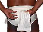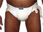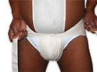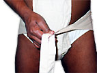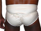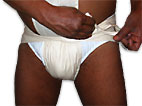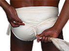 | 7. Release the “tail” from under the chin and pull down over the straps to tighten it between the legs.8. Pull the “tail” through the legs so it is folded back on itself, and bring it up to the straps at the back. Whilst doing this it is important for men to make sure that the genitals are balanced. | |
